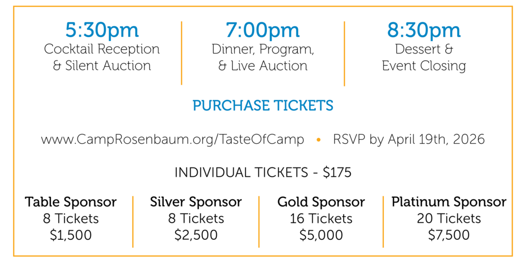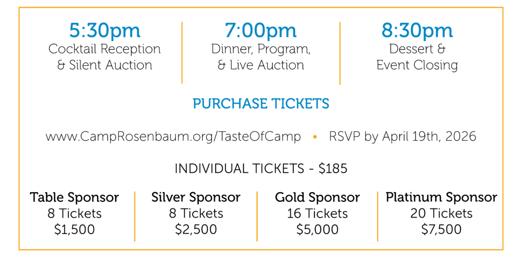 Join us for the 13th Annual Taste of Camp fundraising event at Castaway Portland on Thursday, May 7th, 2026! We’re excited to host this year’s event to celebrate our supporters from all over Oregon and SW Washington. Join our community partners, donors, and the friends and family of Camp Rosenbaum as we aspire to make a difference!